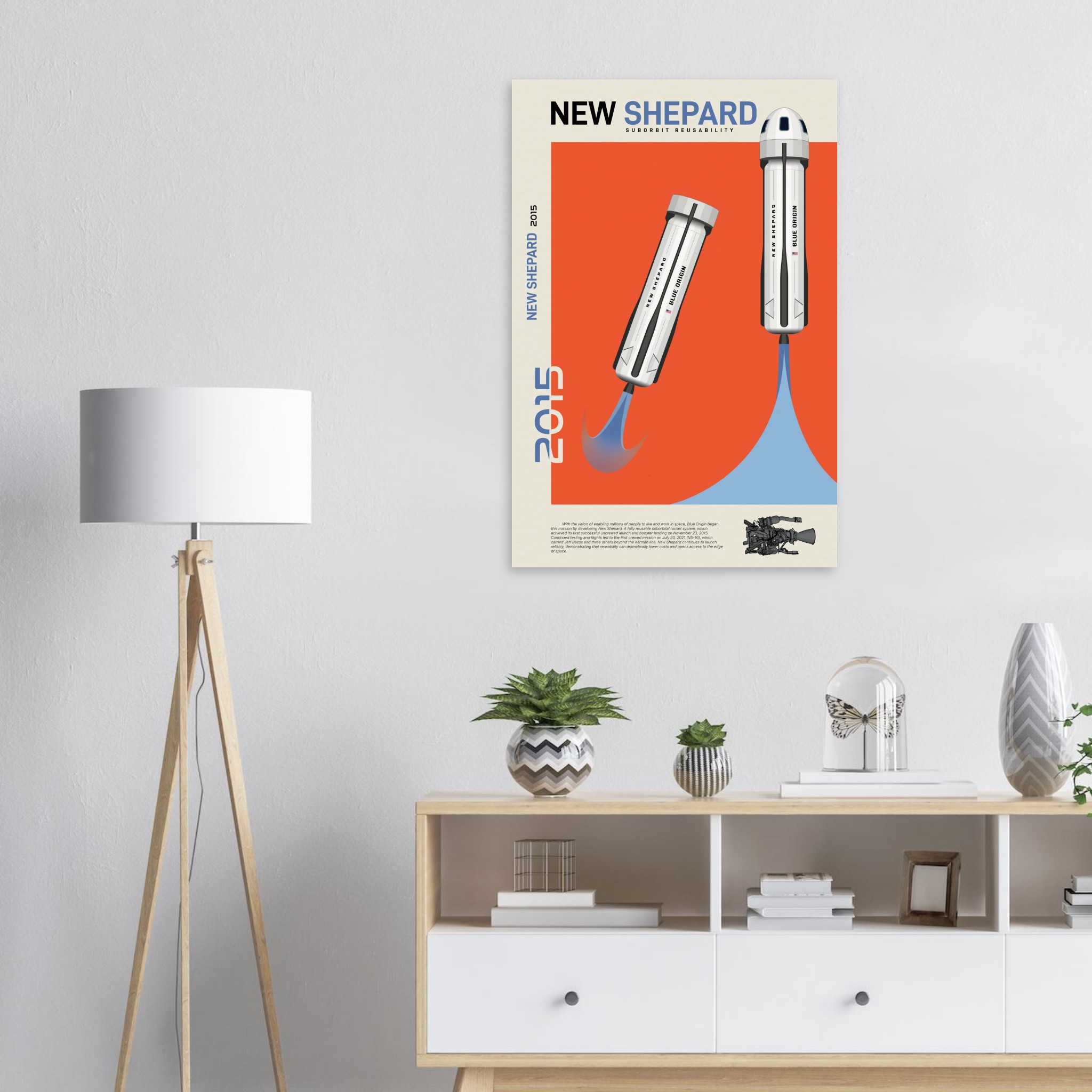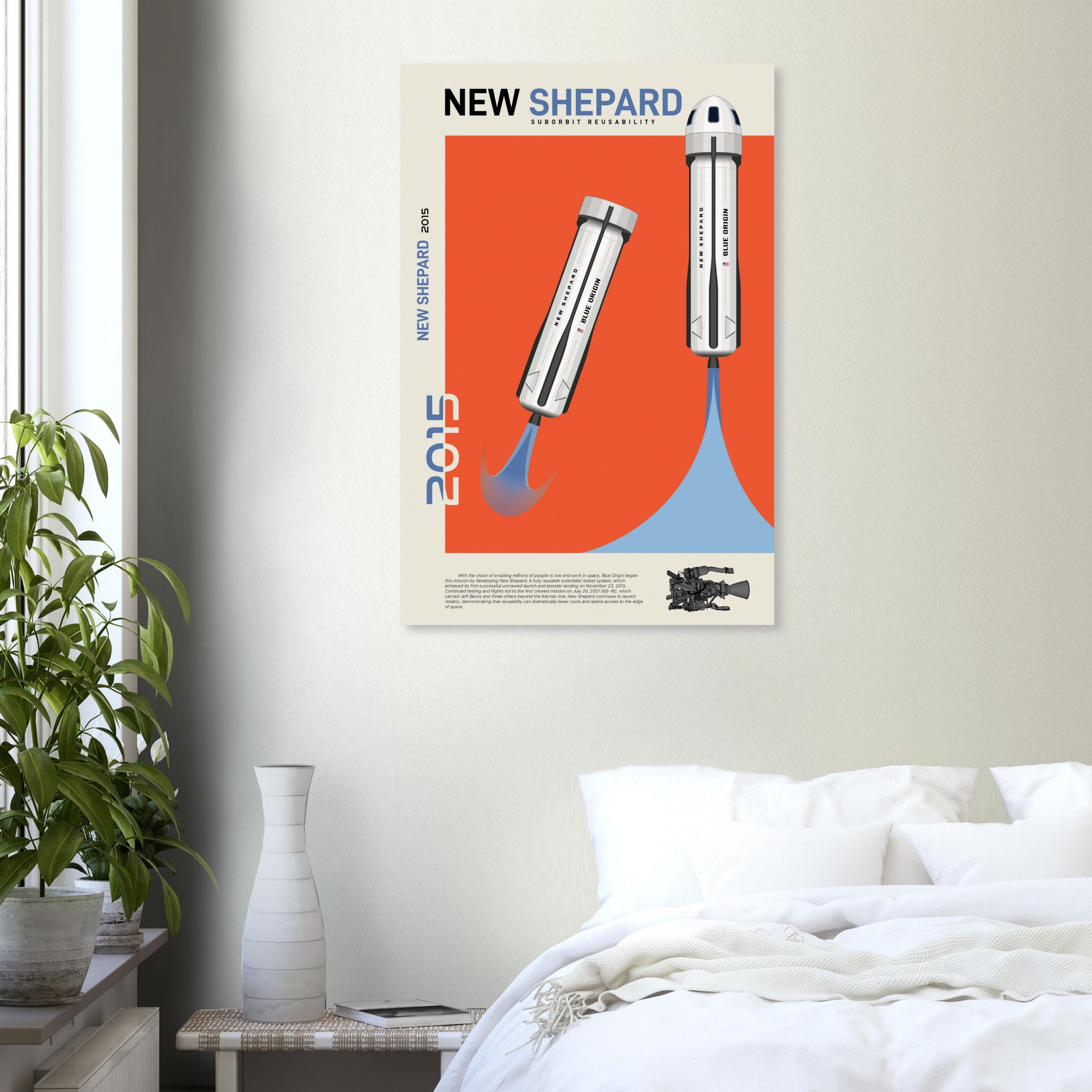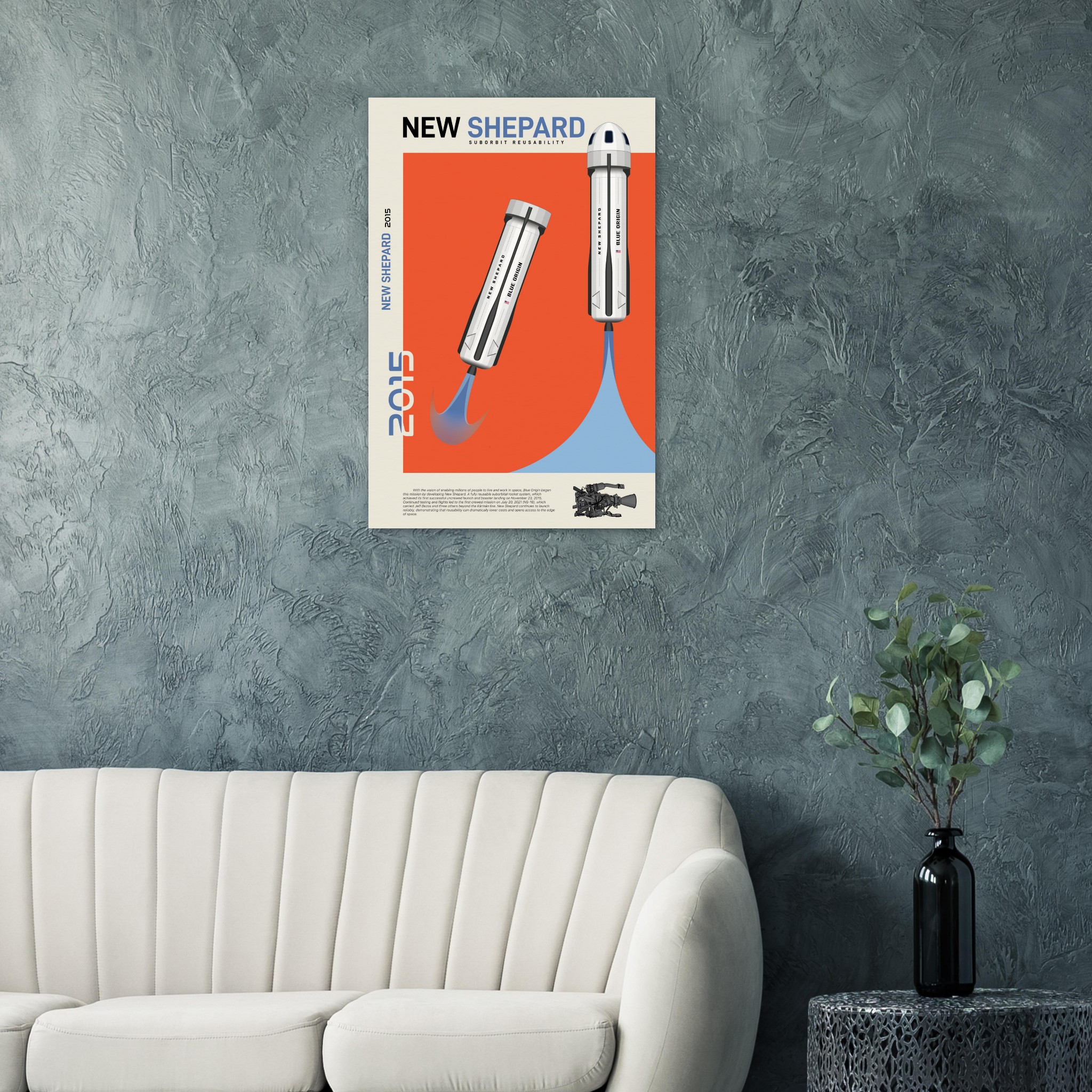 A futuristic/retro poster showcasing New Shepard, printed on master’s edition archival paper, in off-white and uncoated, offers museum-quality for art enthusiasts seeking a luxurious way to enjoy world-class artworks: