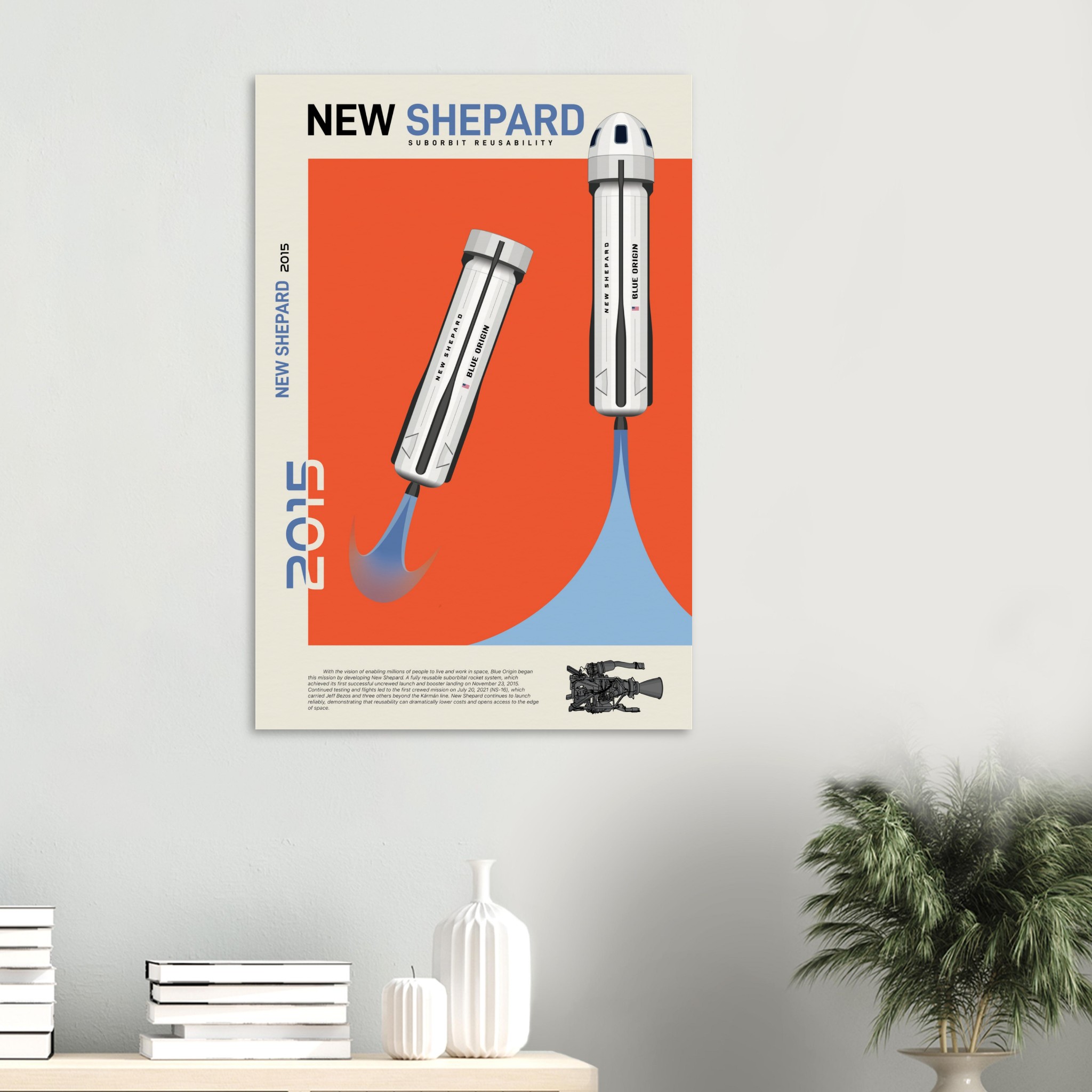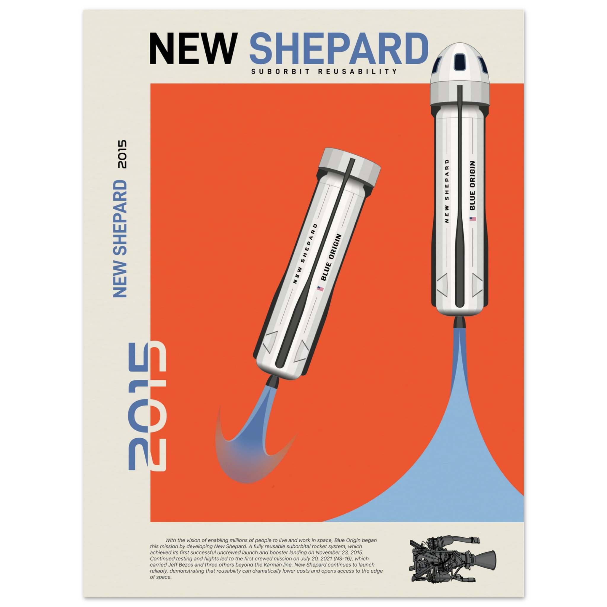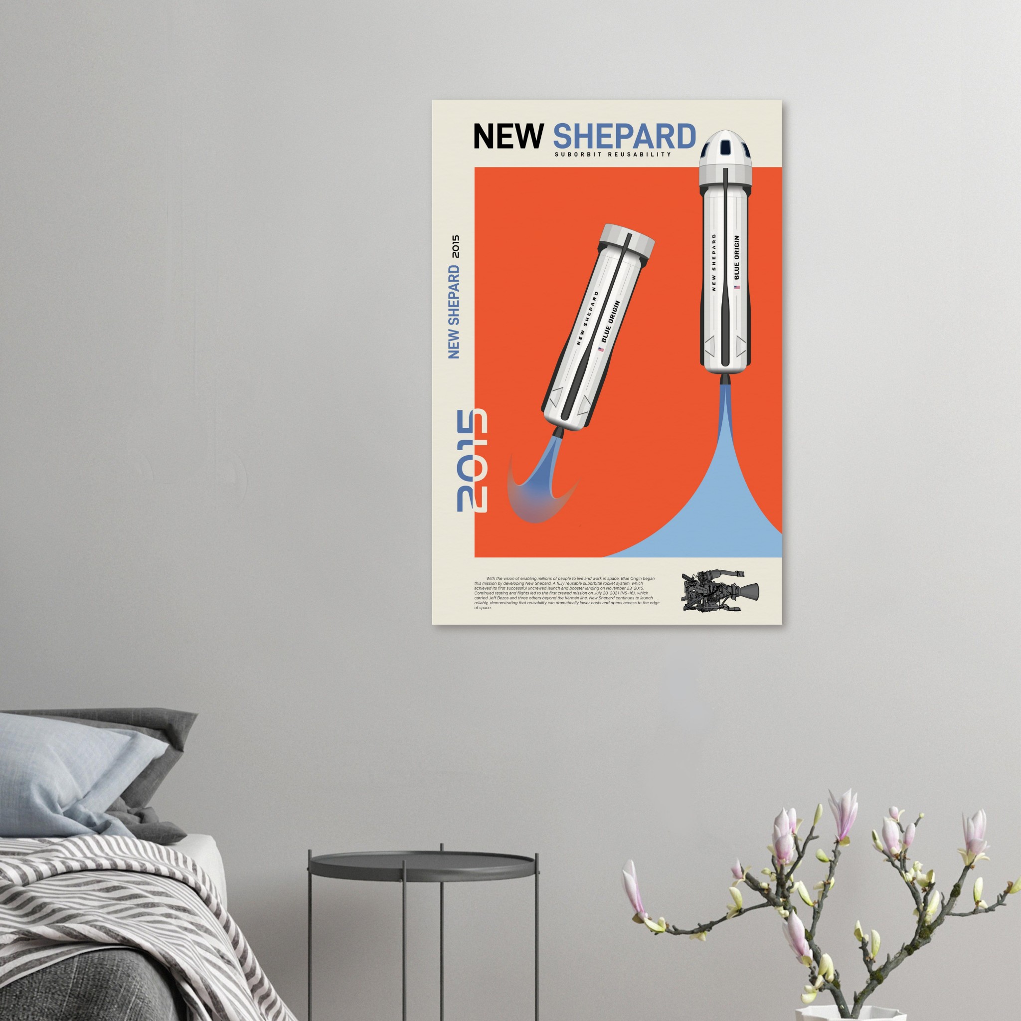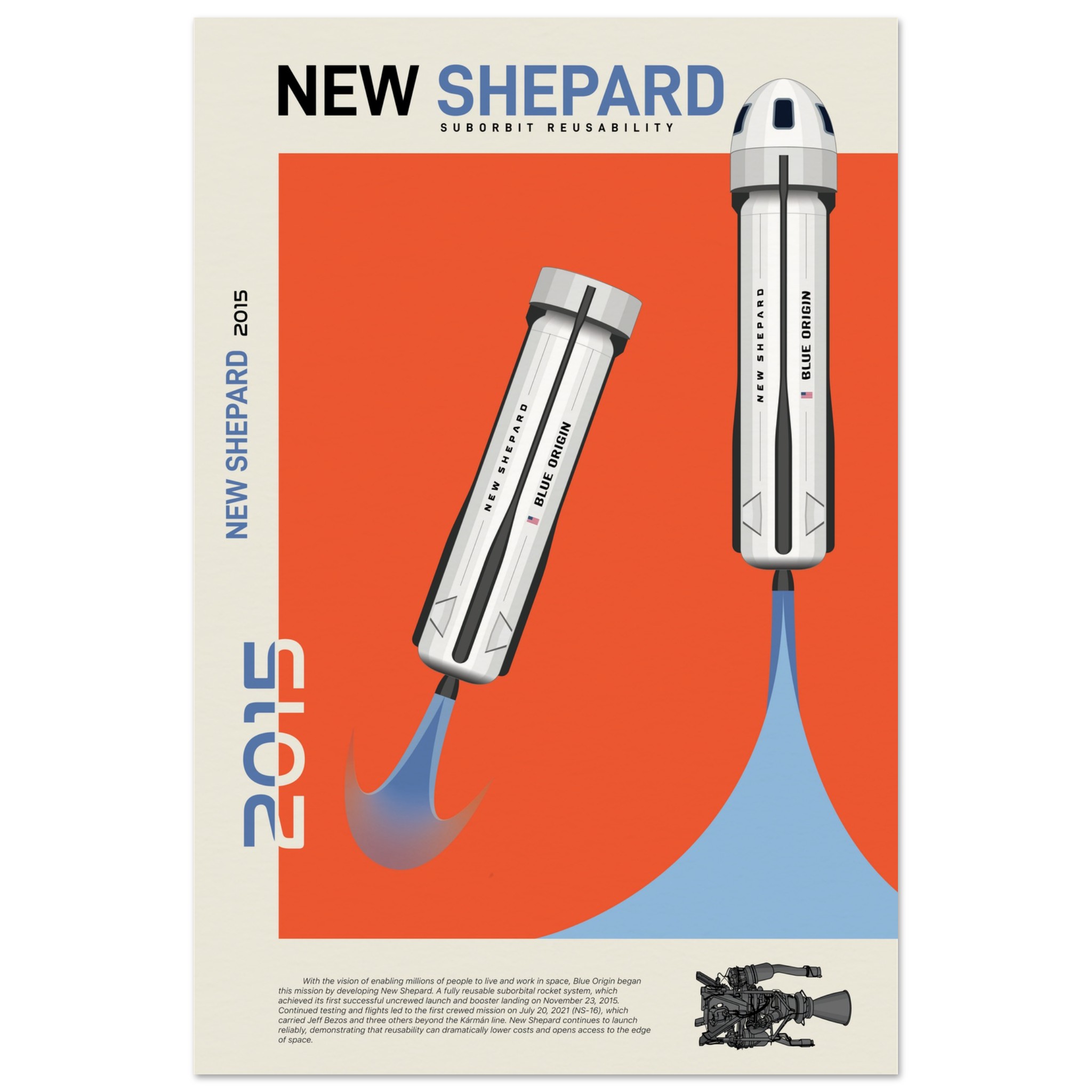 A futuristic/retro poster showcasing New Shepard, printed on master’s edition archival paper, in off-white and uncoated, offers museum-quality for art enthusiasts seeking a luxurious way to enjoy world-class artworks: