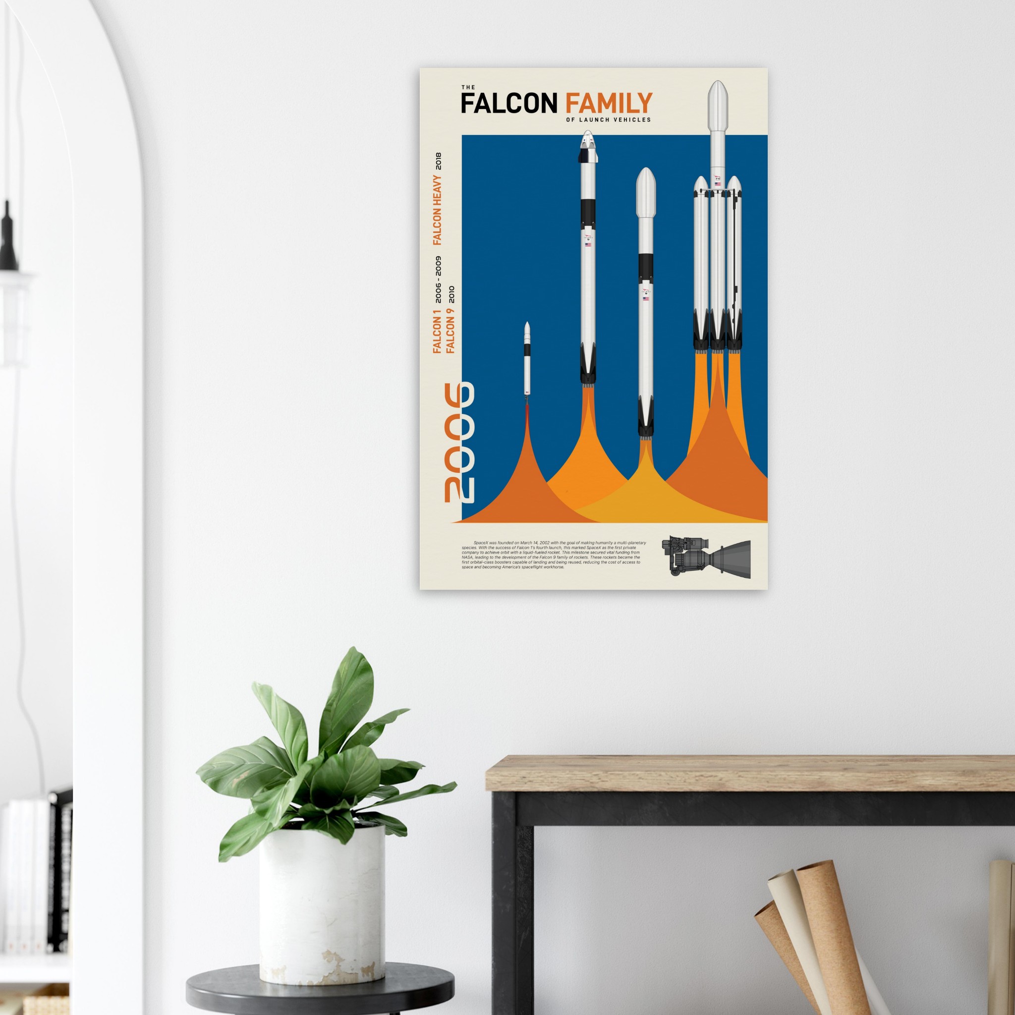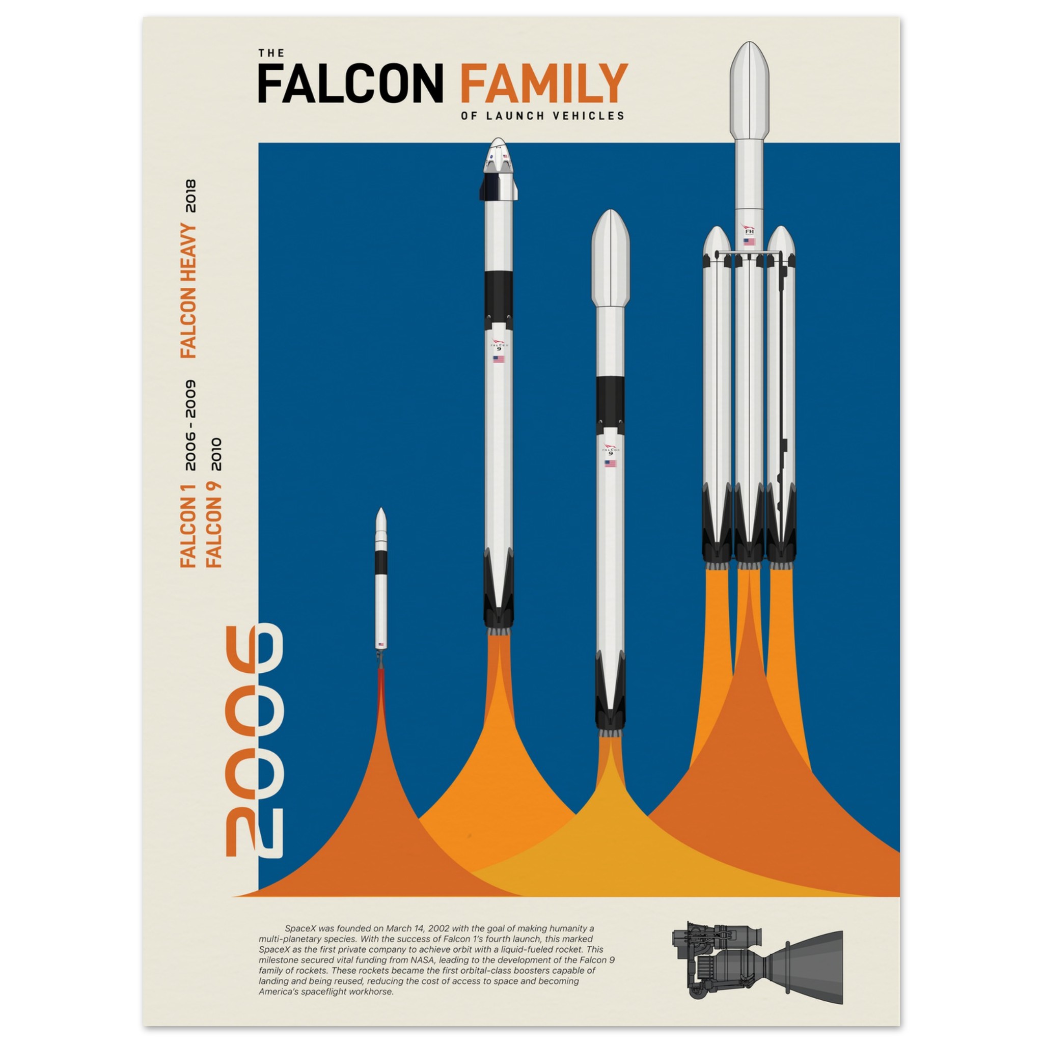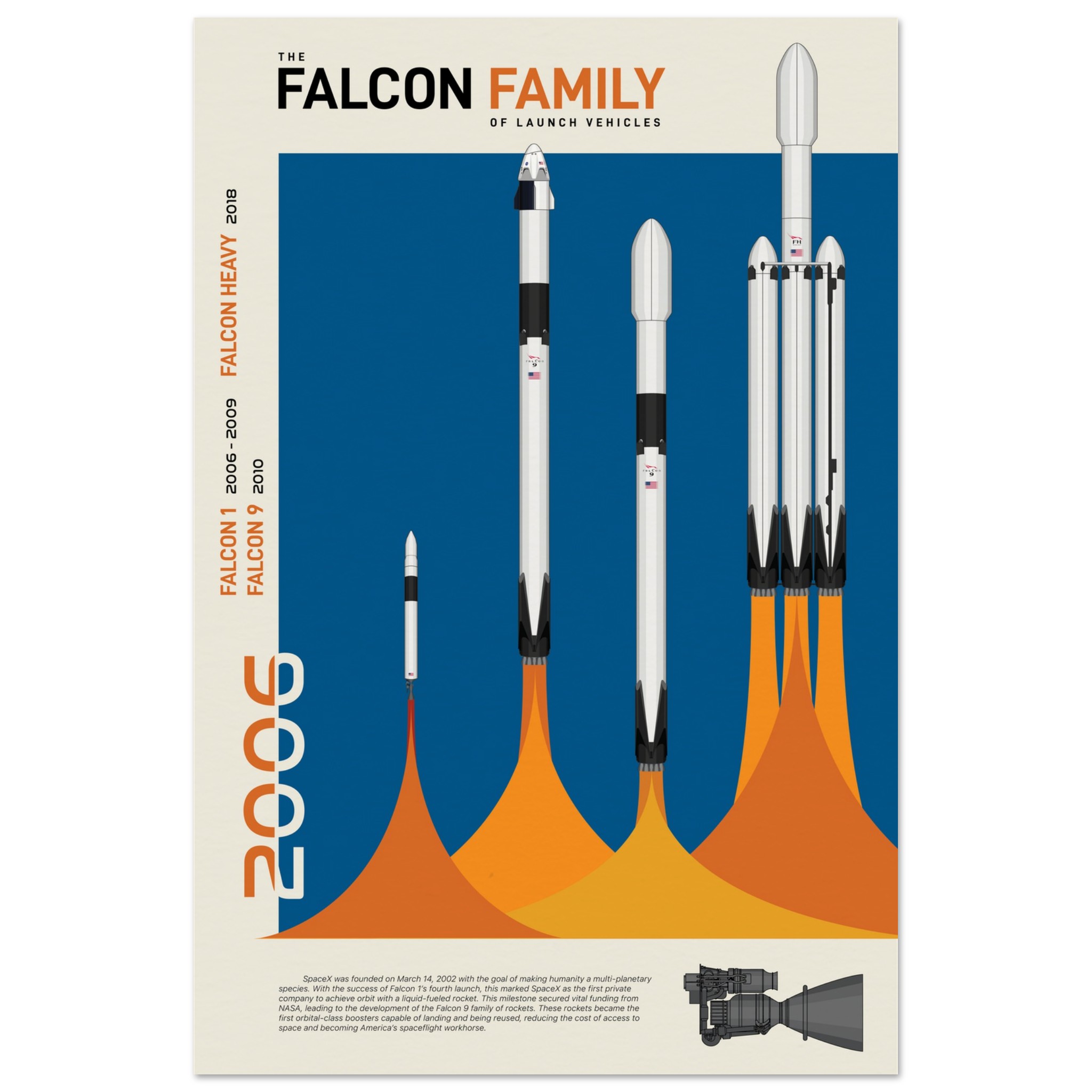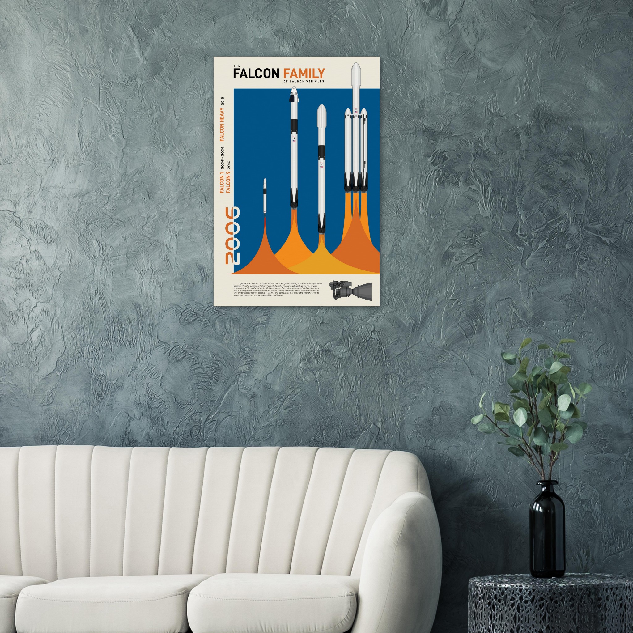 A futuristic/retro poster showcasing the Falcon Family of launch vehicles printed on master’s edition archival paper, in off-white and uncoated, offers museum-quality for art enthusiasts seeking a luxurious way to enjoy world-class artworks:
