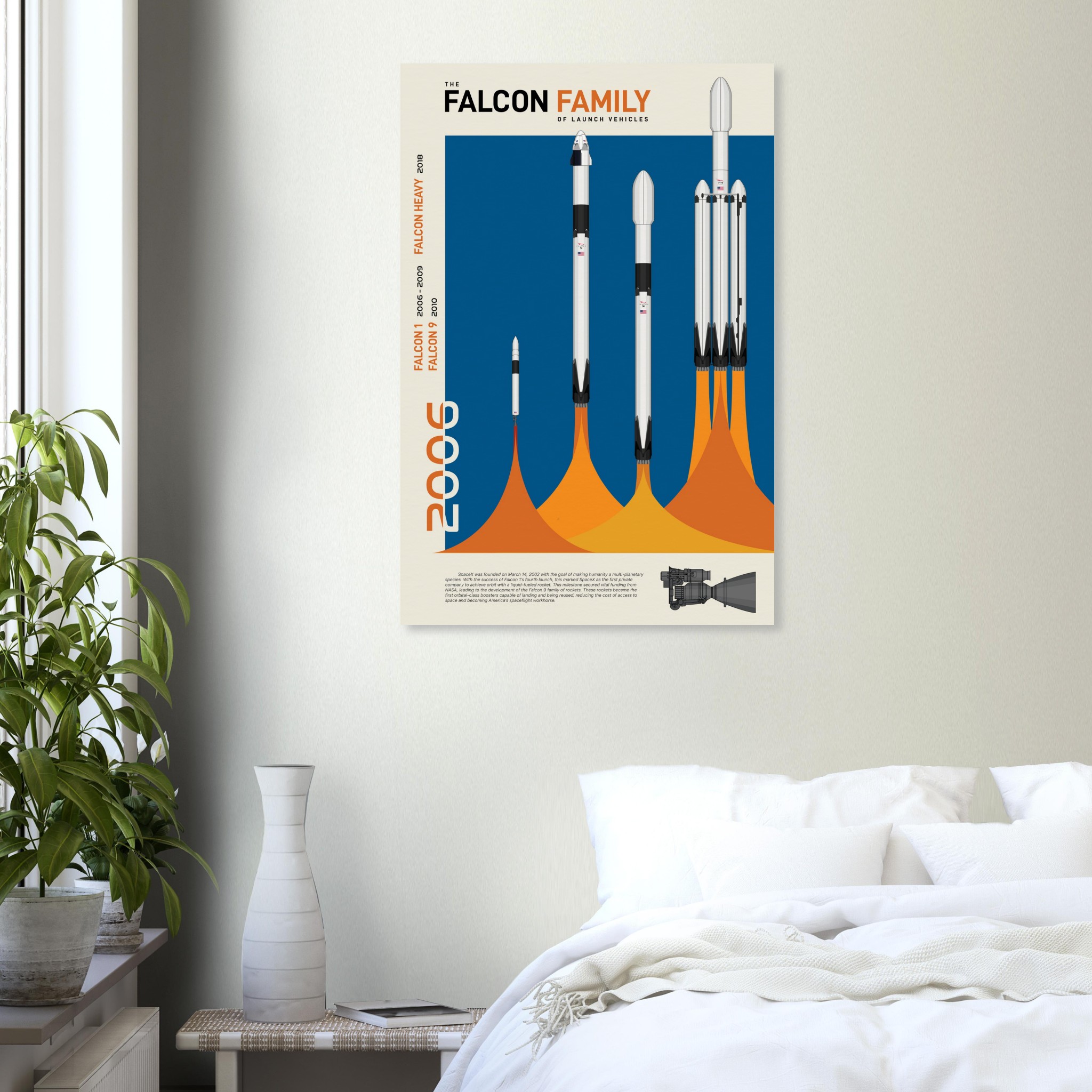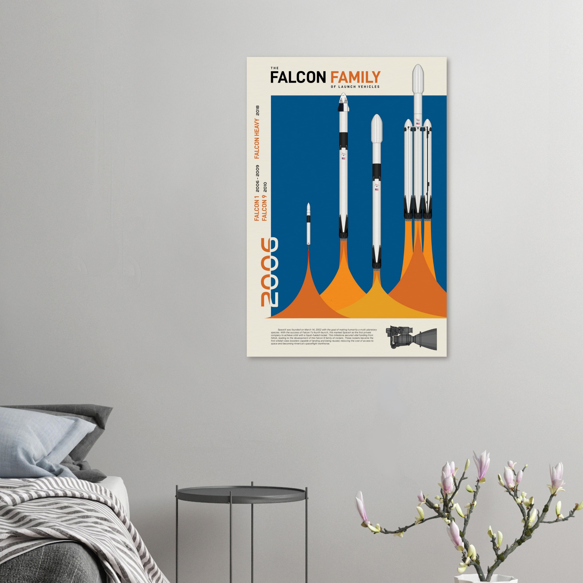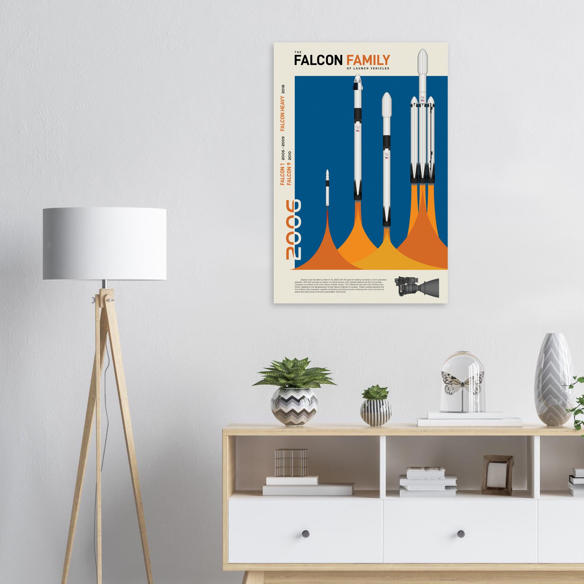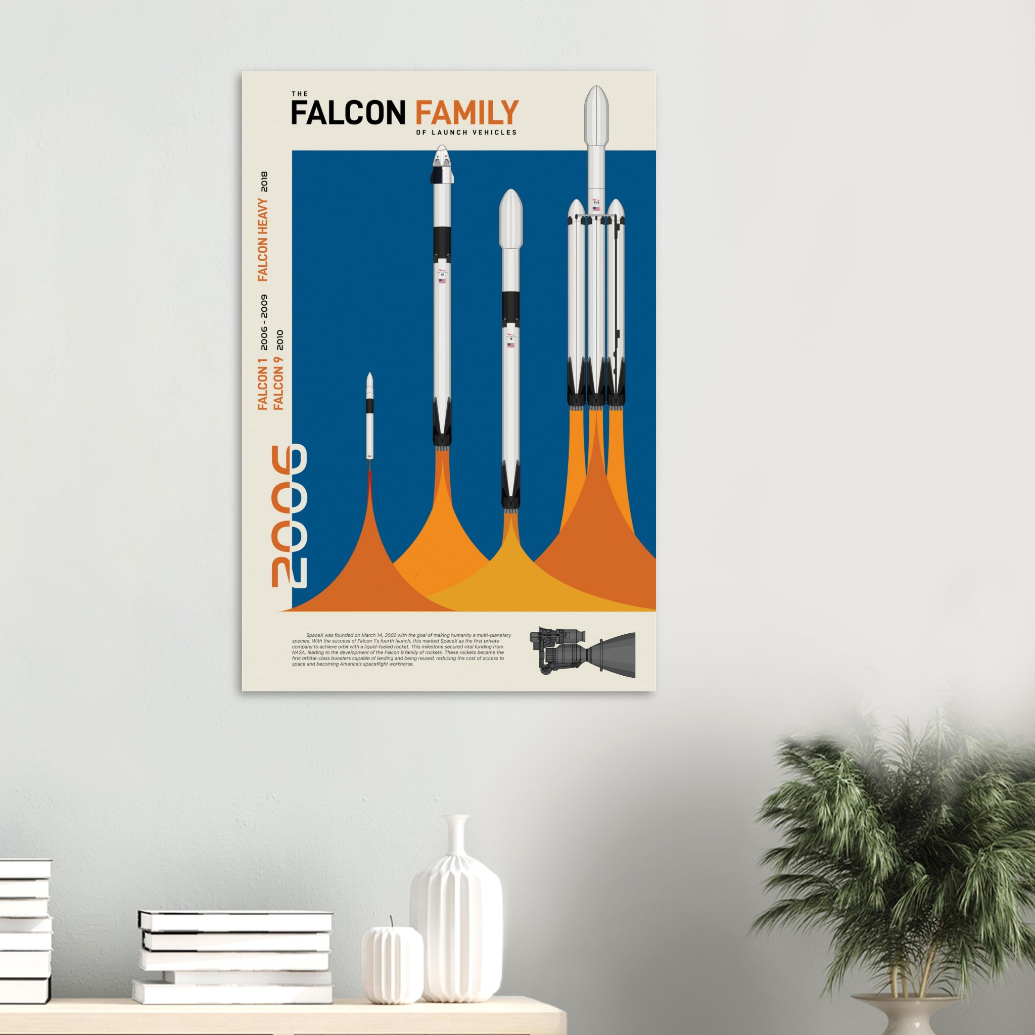 A futuristic/retro poster showcasing the Falcon Family of launch vehicles printed on master’s edition archival paper, in off-white and uncoated, offers museum-quality for art enthusiasts seeking a luxurious way to enjoy world-class artworks: