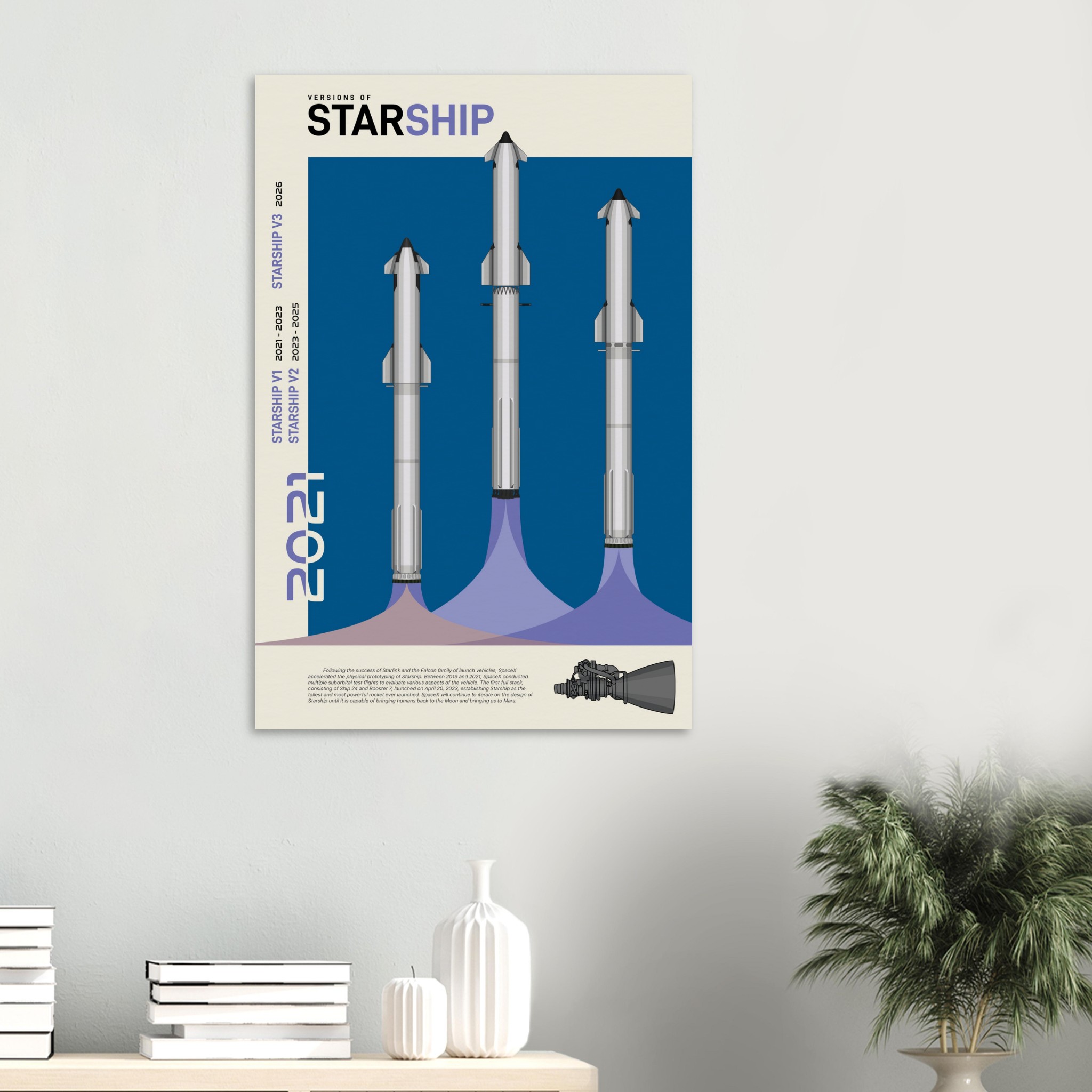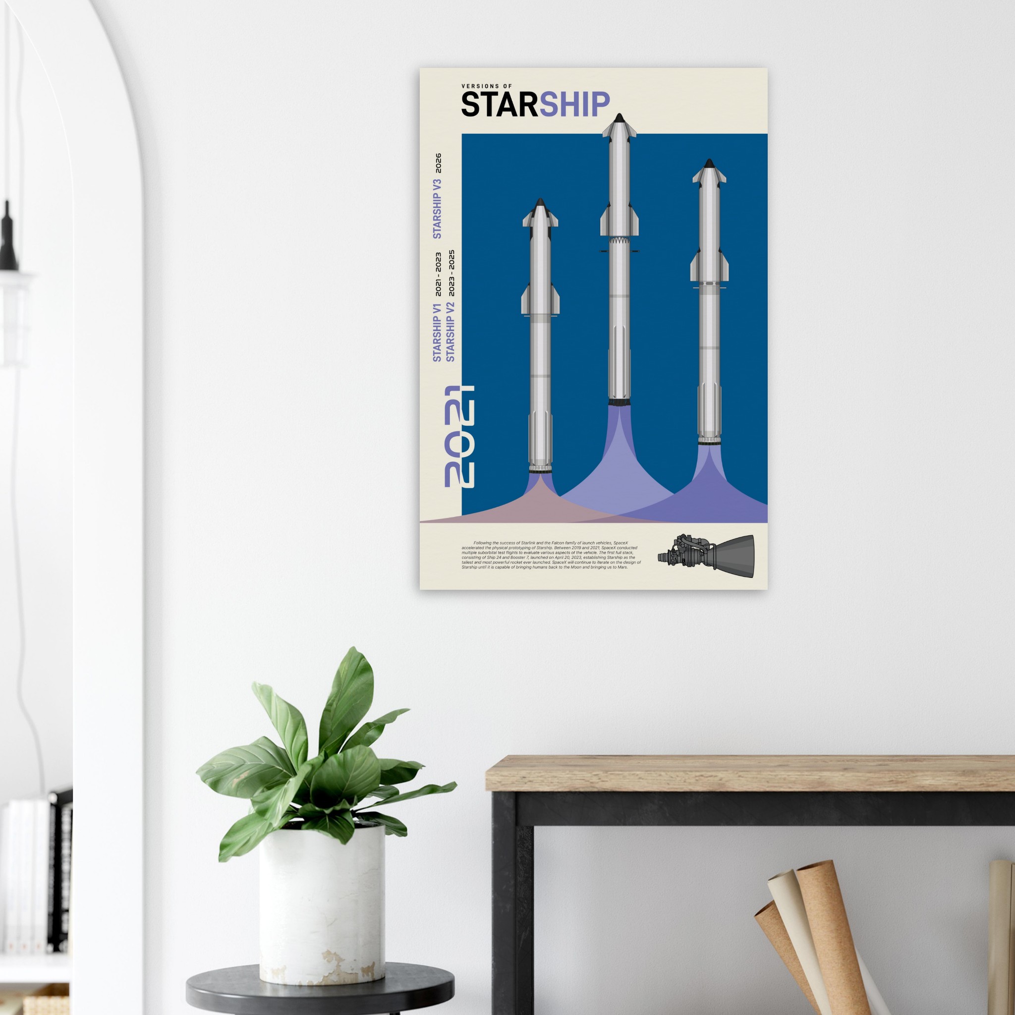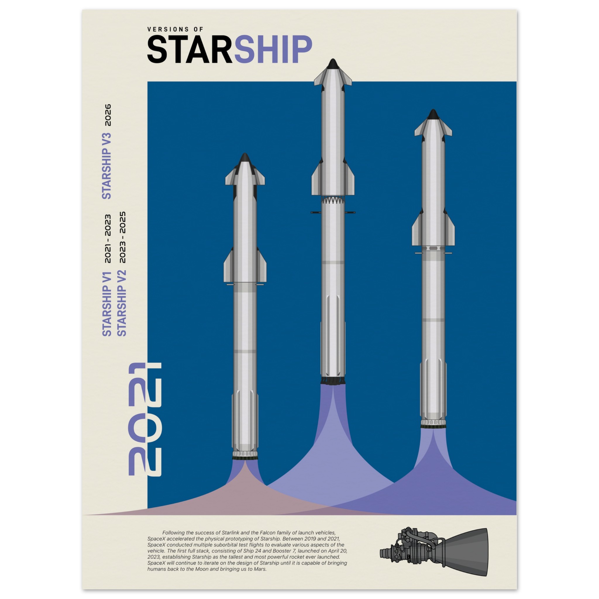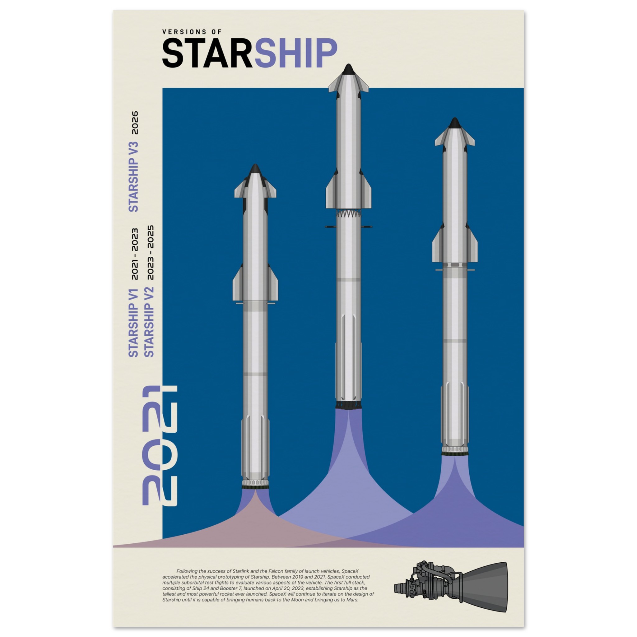 A futuristic/retro poster showcasing the so far three Versions of Starship printed on master’s edition archival paper, in off-white and uncoated, offers museum-quality for art enthusiasts seeking a luxurious way to enjoy world-class artworks: