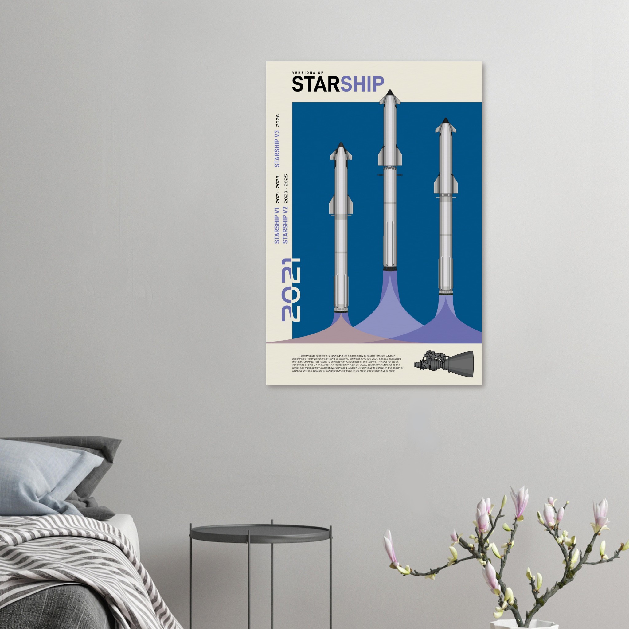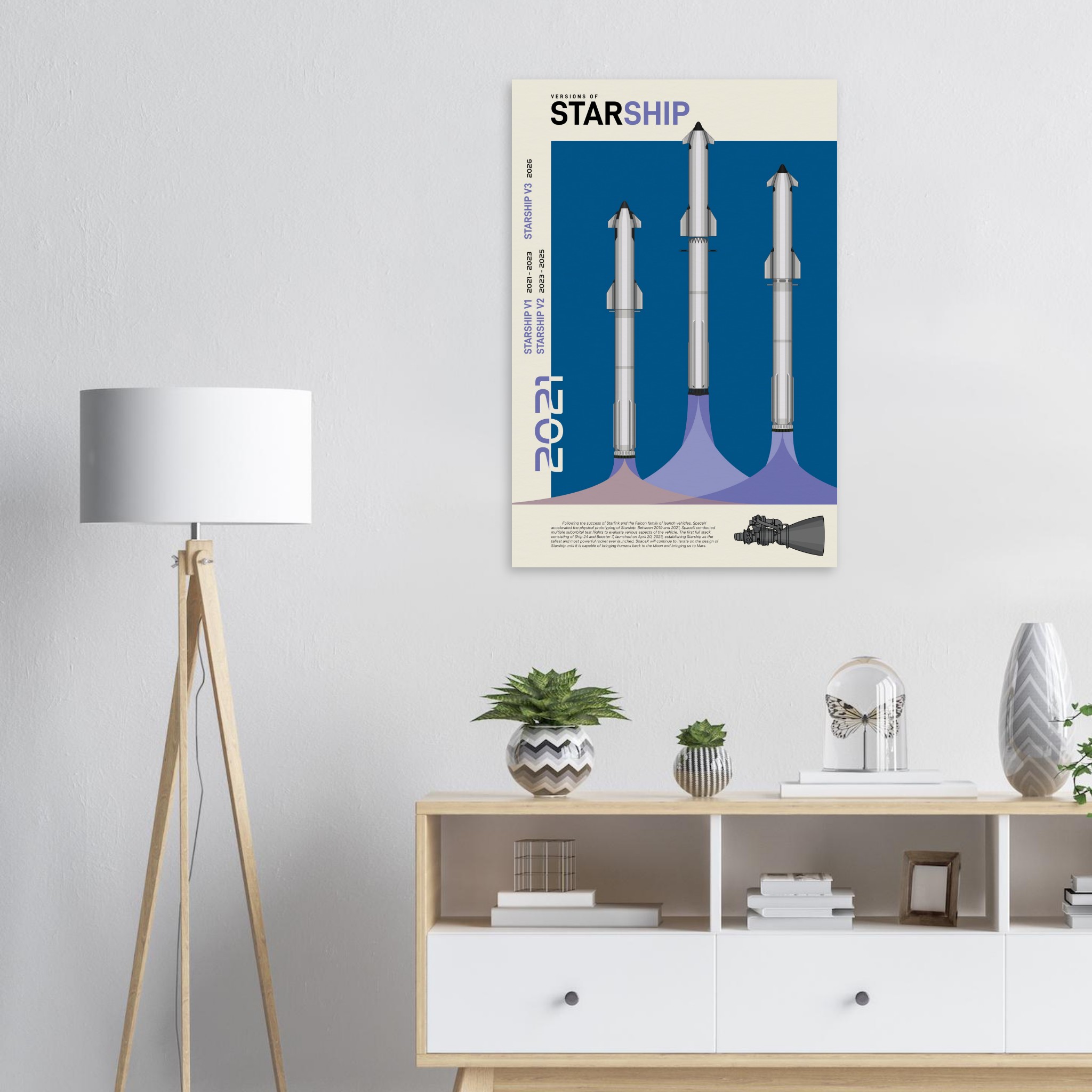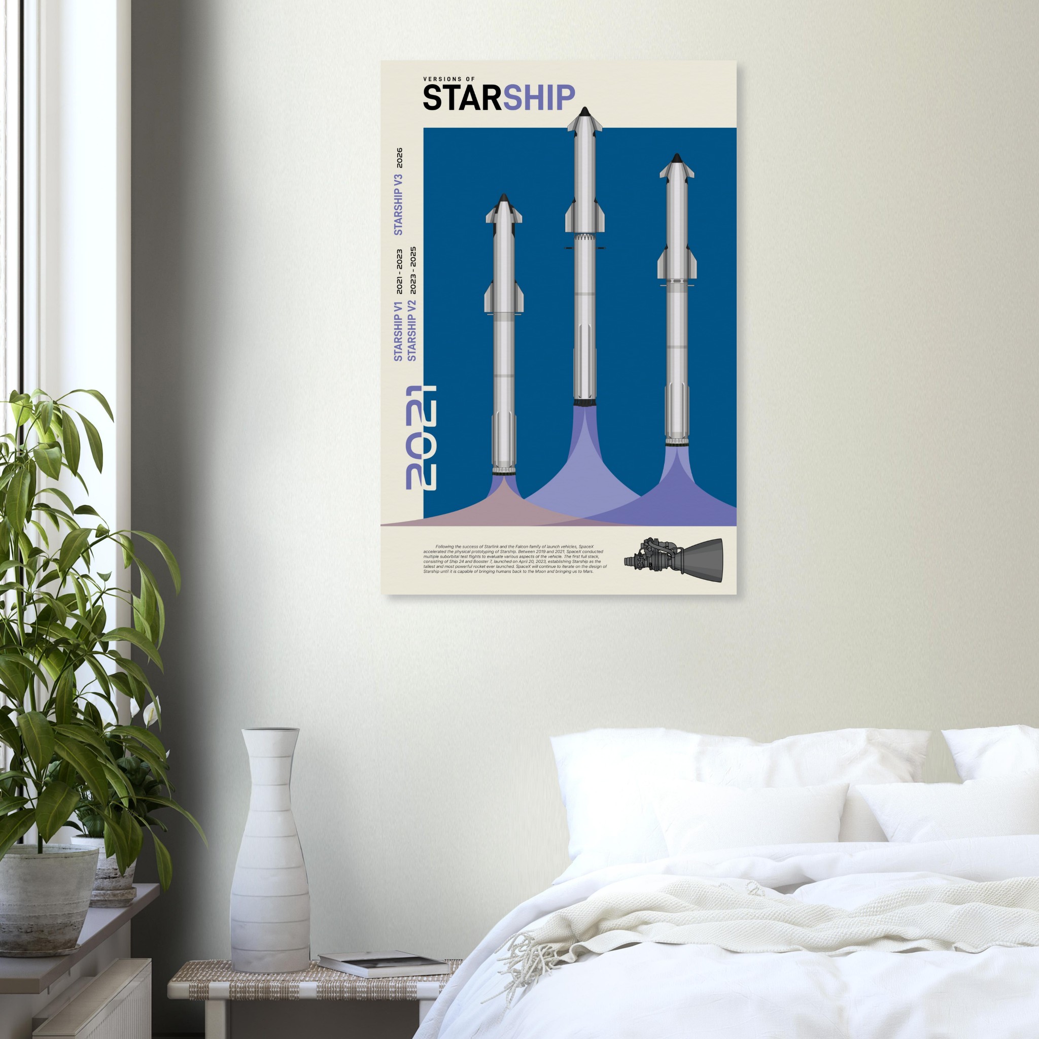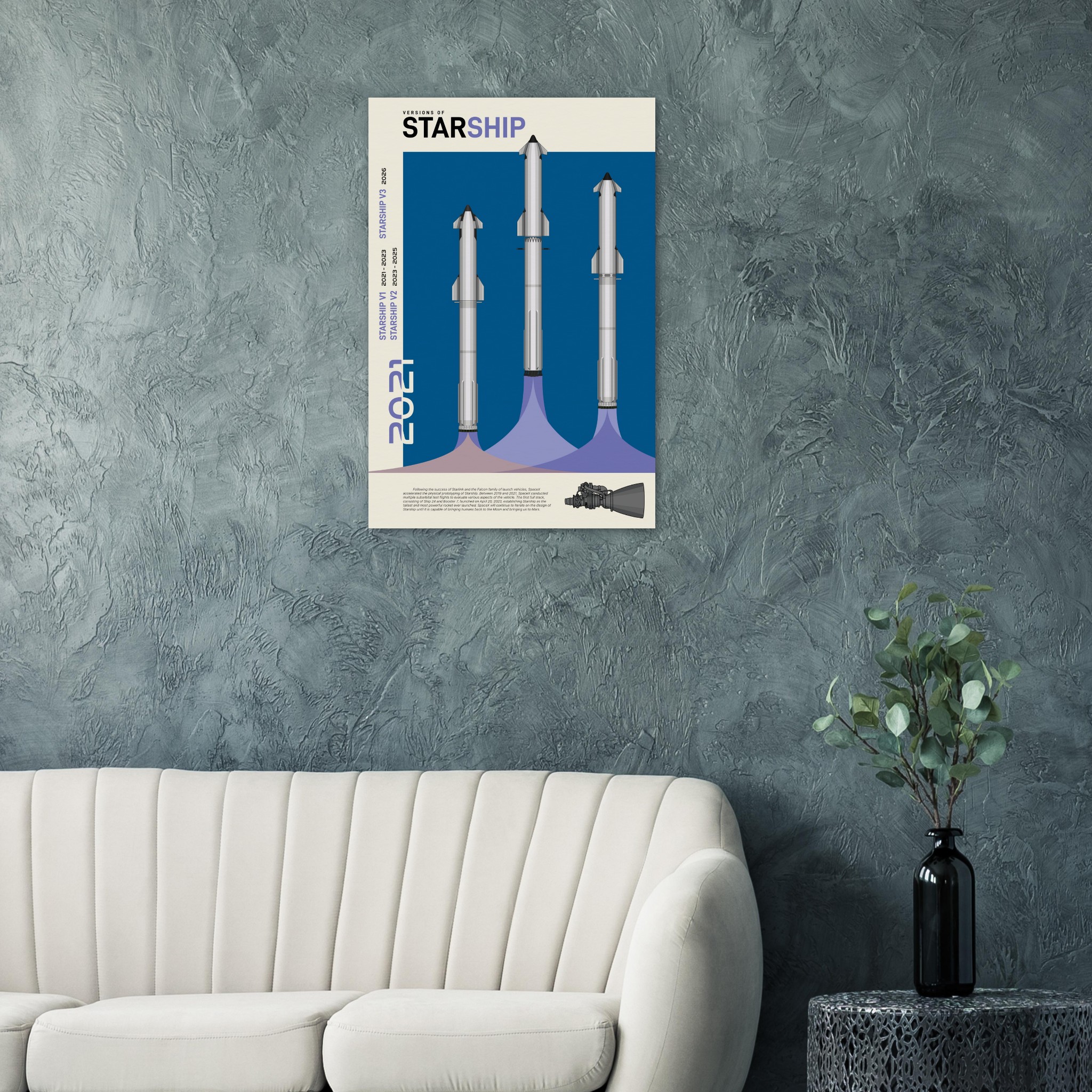 A futuristic/retro poster showcasing the so far three Versions of Starship printed on master’s edition archival paper, in off-white and uncoated, offers museum-quality for art enthusiasts seeking a luxurious way to enjoy world-class artworks: